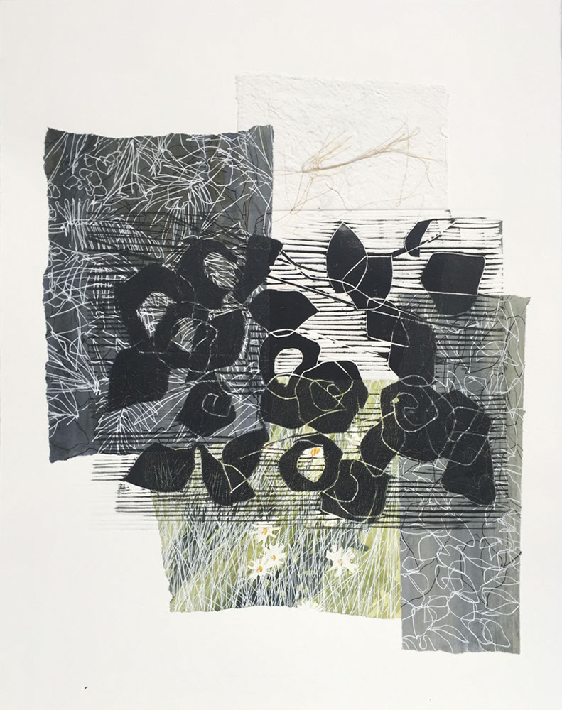 monotype, aquarelle, papier ancien, papier maison avec fils de soie, gravure sur bois